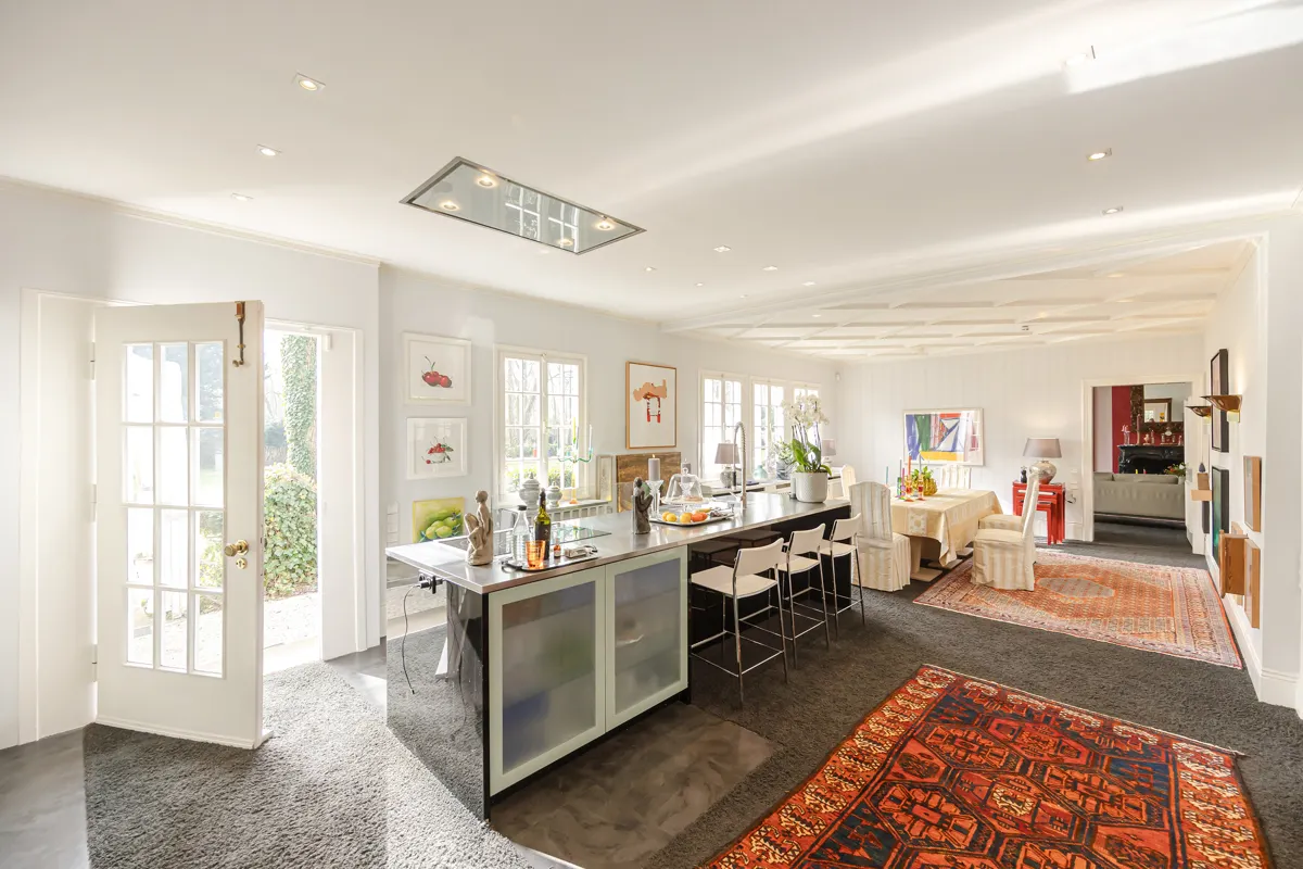 Das 1945 erbaute und 2014 sanierte Haus bietet ca. 312 m² Wohnfläche, ca. 120 m² Nutzfläche sowie 7 Zimmer, darunter 3 Schlafzimmer und 3 Bäder. Großzügige Grundrisse, hohe Decken und große Fensterfronten schaffen ein repräsentatives Raumgefühl und verbinden Innen- und Außenbereiche harmonisch.