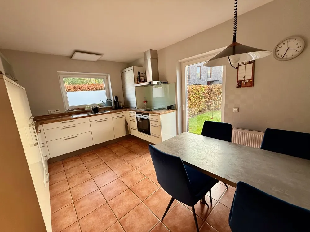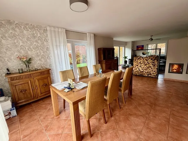 Das Erdgeschoss ist vollständig gefliest und umfasst ein großzügiges Wohn- und Esszimmer mit separater Küche, Kamin und Zugang zur nach Westen ausgerichteten Terrasse. Eine geräumige Eingangsdiele mit Garderobe, ein Hauswirtschaftsraum sowie ein Gäste-WC komplettieren diese Ebene.