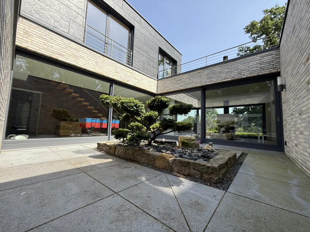 Auf rund 400 m² Wohnfläche überzeugt die Villa durch ein offenes, lichtdurchflutetes Raumkonzept. Der repräsentative Wohn- und Essbereich mit bodentiefen Fenstern öffnet sich zur großzügigen Terrasse mit Blick in den parkähnlichen Garten. Ein besonderes Highlight ist das zentrale Atrium mit Wasserspiel, das als lichtspendendes Herzstück des Hauses dient. Die hochwertige, offene Küche mit angrenzendem Abstellraum lässt sich bei Bedarf elegant abtrennen.