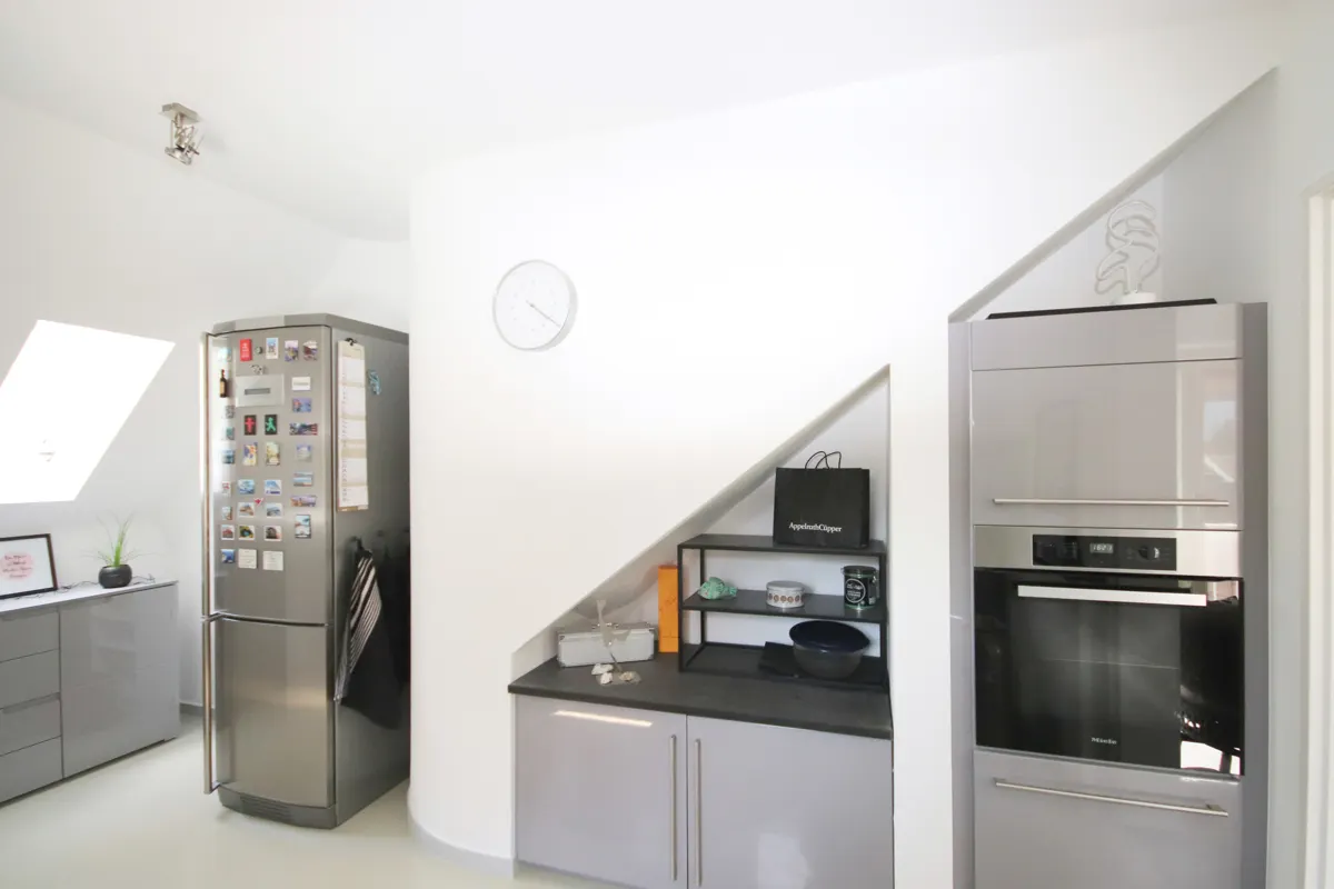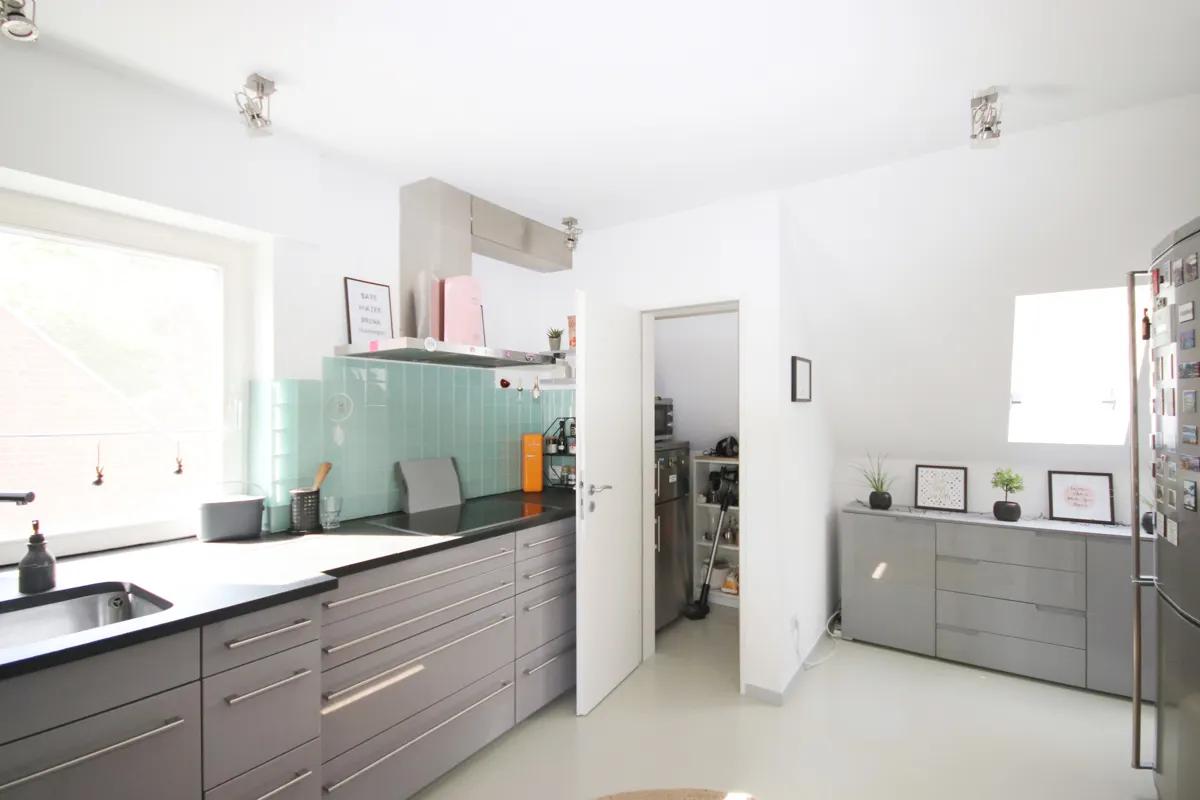 Angrenzend befindet sich die geräumige Küche, die mit modernen Küchenmöbeln sowie einem praktischen Abstellraum punktet.