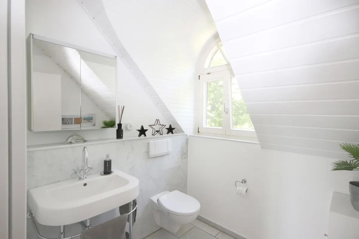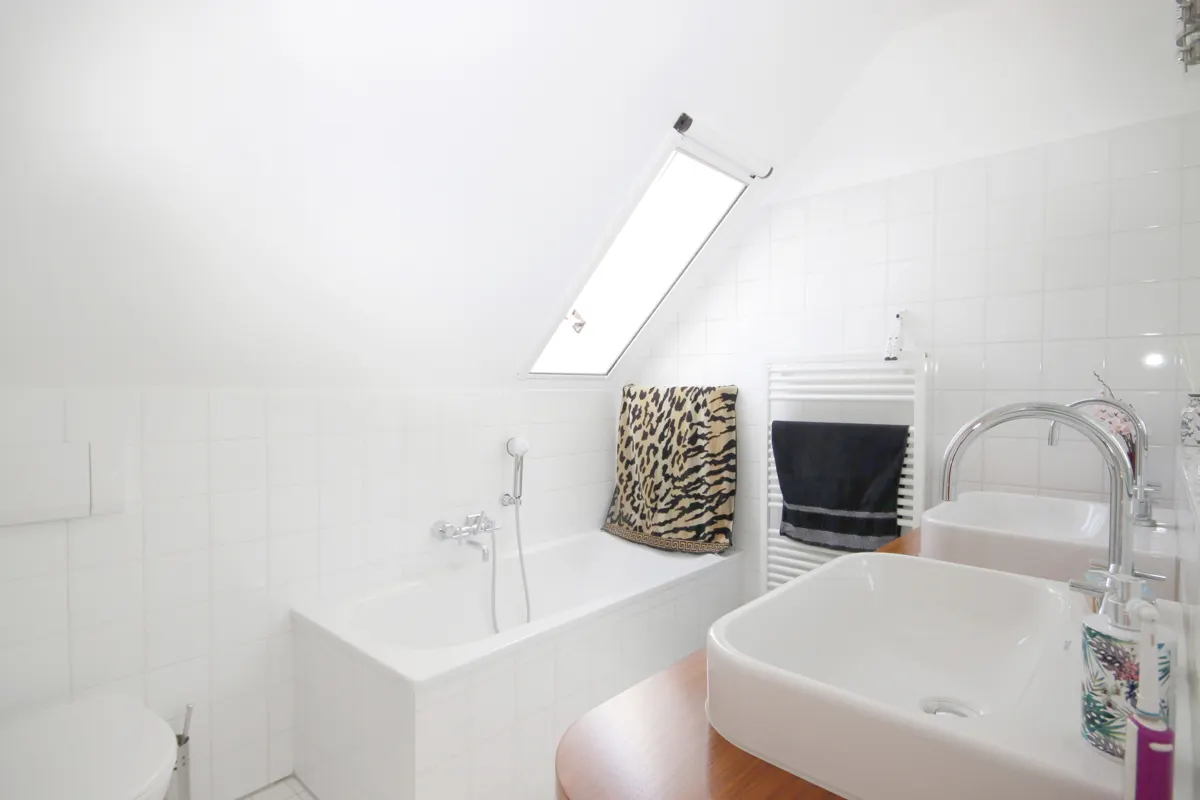 Dieses ist in klassischem Weiß gefliest und verfügt über eine Badewanne, eine separate Dusche, 2 Waschbecken sowie ein WC.