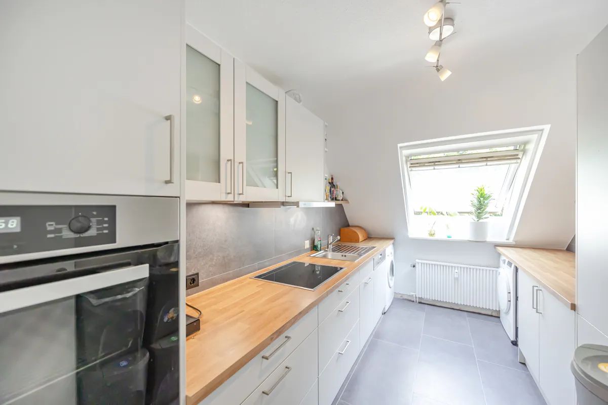 Die neuwertige, moderne Küche von der Fa. Häcker wurde mit hochwertigsten Einbaugeräten der Marken Miele und Siemens ausgestattet und verfügt über einen Waschmaschinen- und Trockneranschluss.
