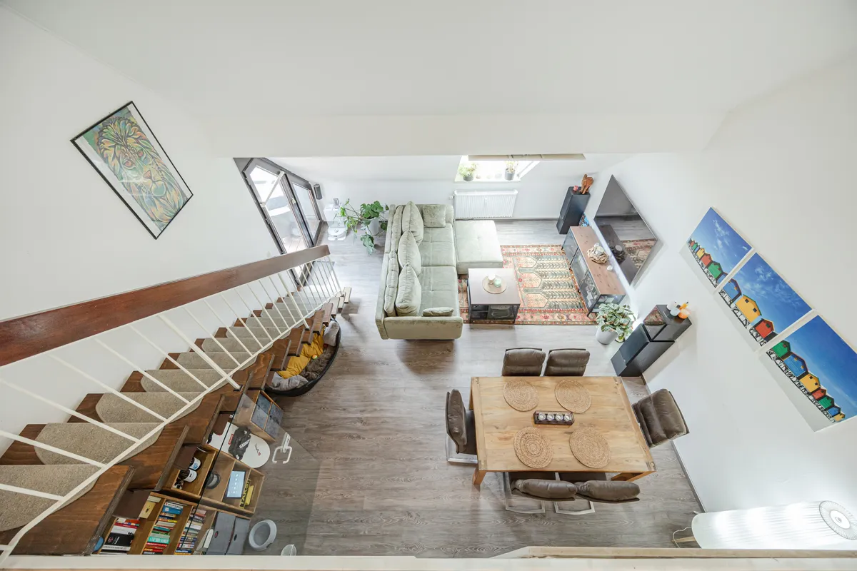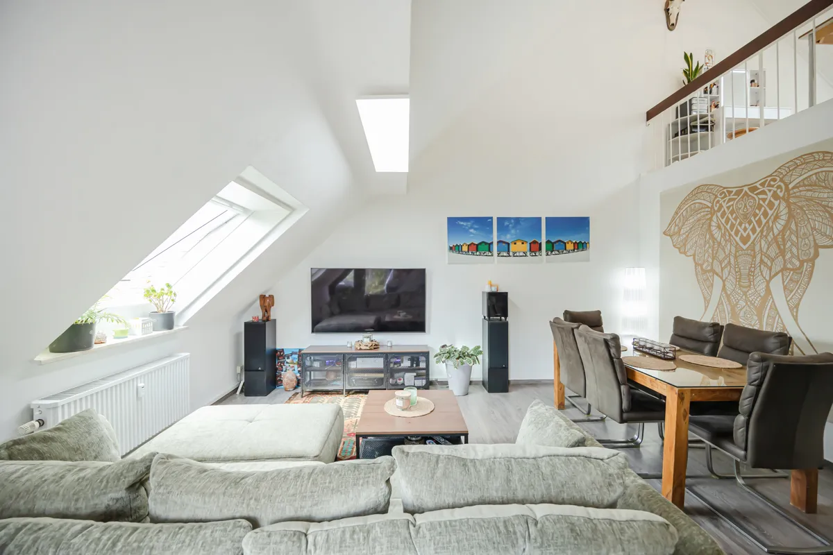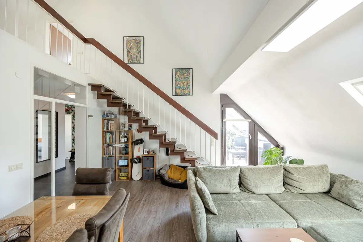 Highlight der Wohnung ist die zum Dach hin offene Gestaltung des weitläufigen Wohn-und Essbereichs, der das Erdgeschoss dominiert. Lichtdurchflutet bietet er viel Platz auch für einen ausladenden Esstisch und den Blick durch die großflächige Verglasung auf die einladende Dachloggia, zu der Sie von hier auch direkten Zugang haben.