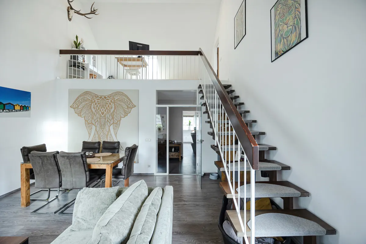 Vom zum Luftraum hin offenen Wohn- und Essbereich führt eine Treppe auf eine großzügige Empore in der oberen Ebene, von der Sie einen eindrucksvollen Blick auf diesen unteren Bereich haben. Die Empore können Sie entsprechend Ihren Wohnraumbedürfnissen z. B. ideal als Arbeitsbereich nutzen.