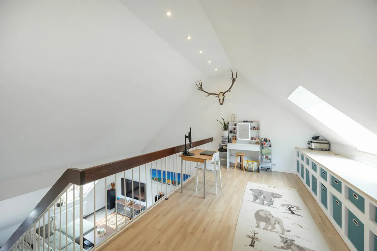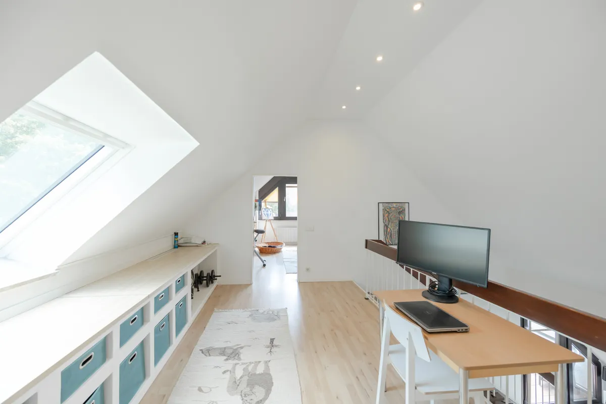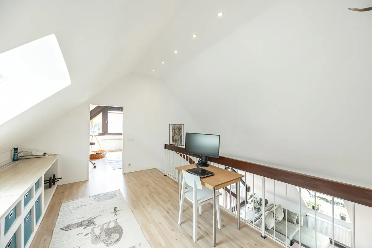Sie verfügt über 4 Wohnräume, eine Küche, ein modernes Bad, ein separates WC und einen Abstellraum. Eine großzügige Empore mit Blick auf den Wohn- und Essbereich in der unteren Ebene rundet das Raumangebot ab.