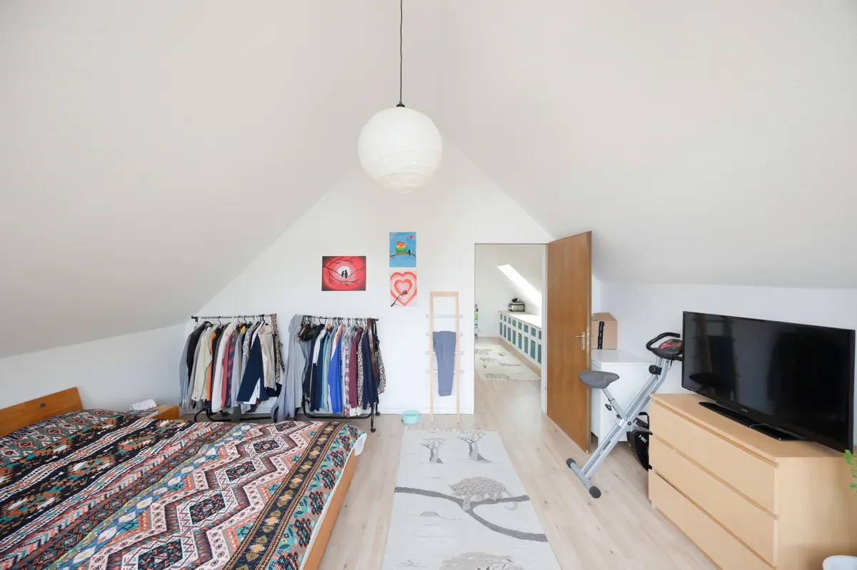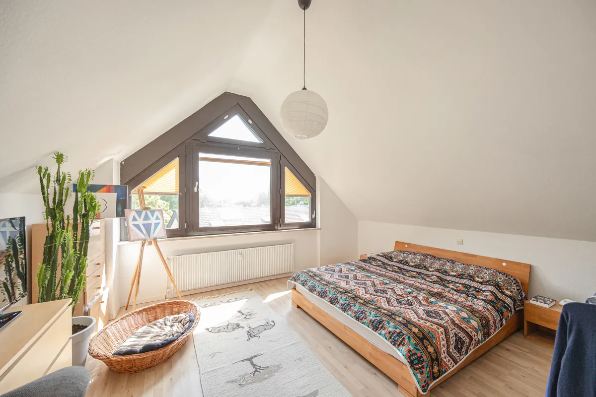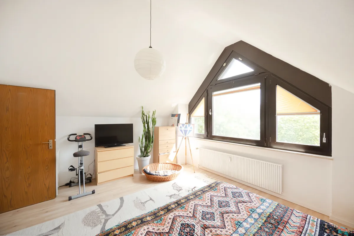 Mit seiner bis in den Giebel geöffneten Decke und der nahezu vollständig verglasten Giebelwand vermittelt dieses ein außergewöhnliches, fast loftartiges Wohngefühl.