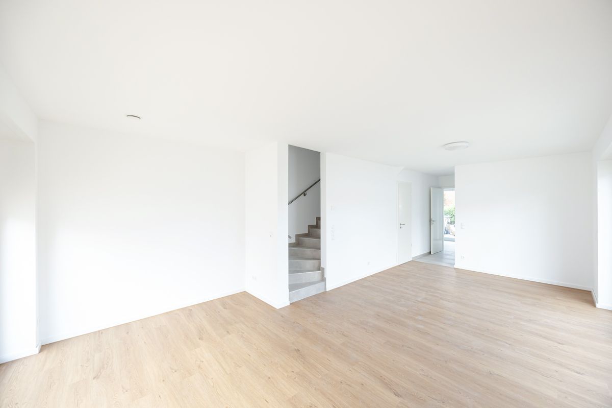 Der offene, lichtdurchflutete Wohn- und Essbereich bildet das Herzstück des Hauses. Bodentiefe Fenster lassen viel Tageslicht herein und schaffen eine freundliche Wohnatmosphäre. Der direkte Zugang zur Terrasse mit angrenzendem Garten lädt zum Verweilen im Freien ein. Ein praktischer Abstellraum ergänzt das Raumangebot im Erdgeschoss.