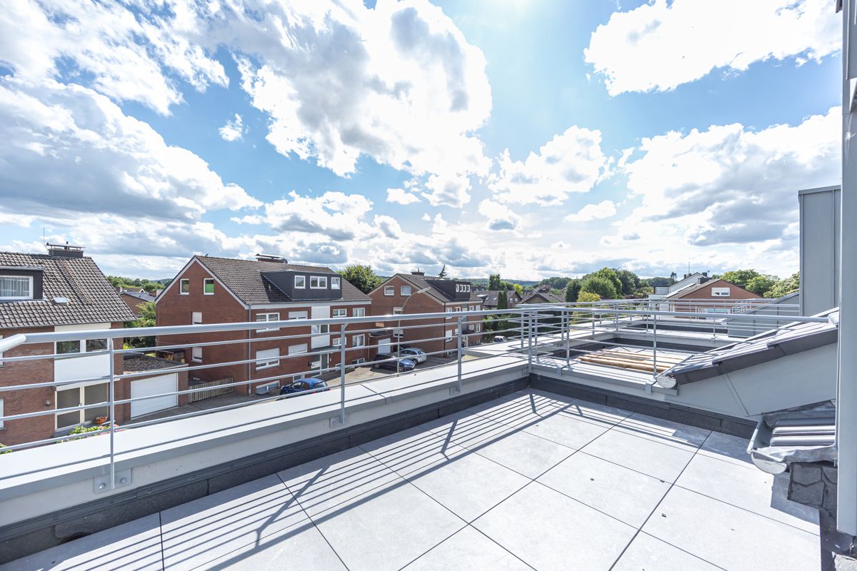 Eine Gartenterrasse sowie eine ca. 10 m² große Dachterrasse mit tollem Ausblick auf die Baumberge sind ein weiteres Highlight dieser lichtdurchfluteten Wohnung.