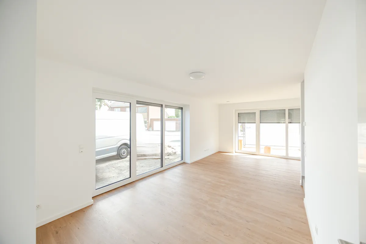 Der offene, lichtdurchflutete Wohn- und Essbereich bildet das Herzstück des Hauses. Bodentiefe Fenster lassen viel Tageslicht herein und schaffen eine freundliche Wohnatmosphäre. Der direkte Zugang zur Terrasse mit angrenzendem Garten lädt zum Verweilen im Freien ein. Ein praktischer Abstellraum ergänzt das Raumangebot im Erdgeschoss.