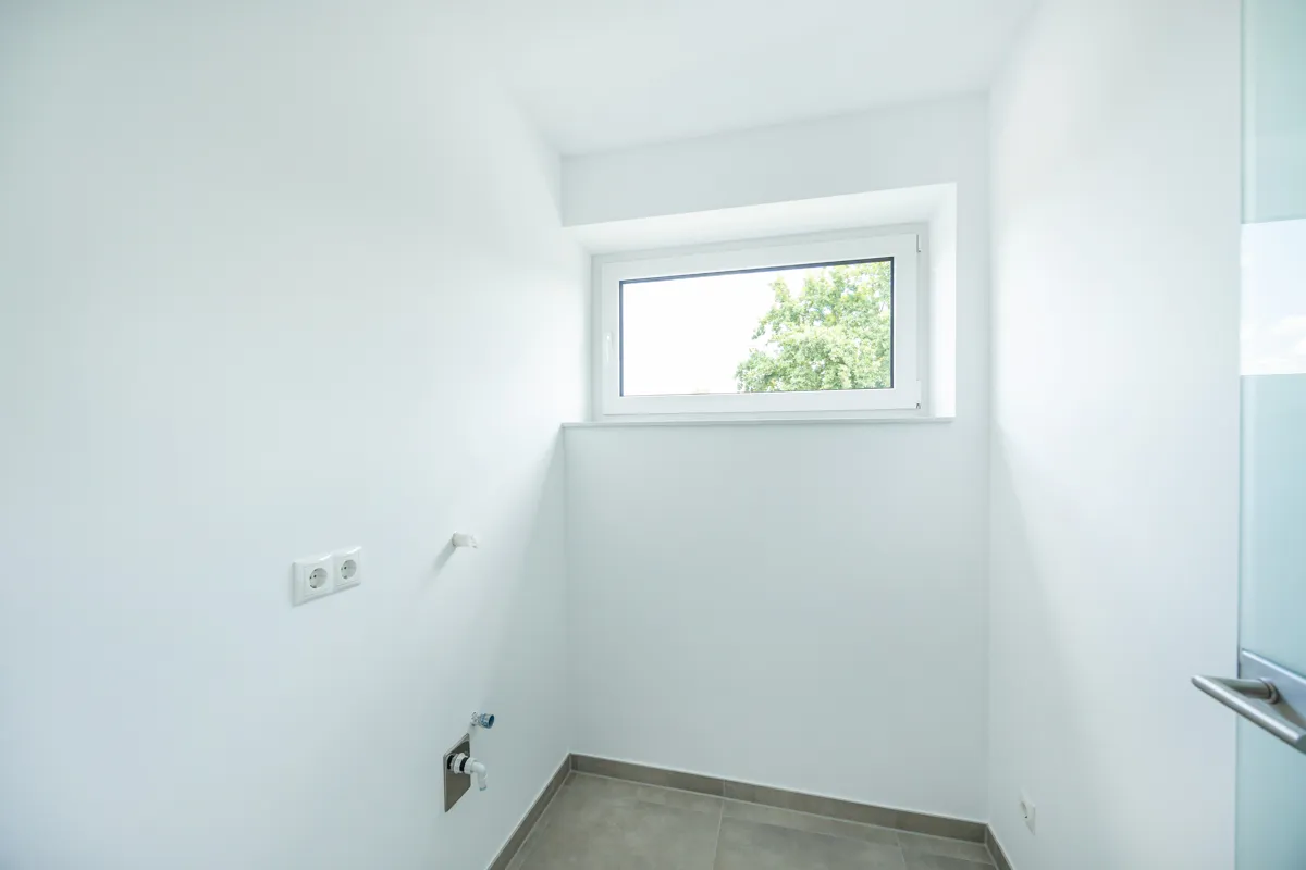 Im Obergeschoss erwarten Sie zwei gut geschnittene Schlafzimmer sowie ein modernes Tageslichtbad mit bodentiefer Dusche, Waschbecken und WC. Für zusätzlichen Komfort steht ein separater Hauswirtschaftsraum mit Anschlussmöglichkeiten für Waschmaschine und Trockner zur Verfügung.