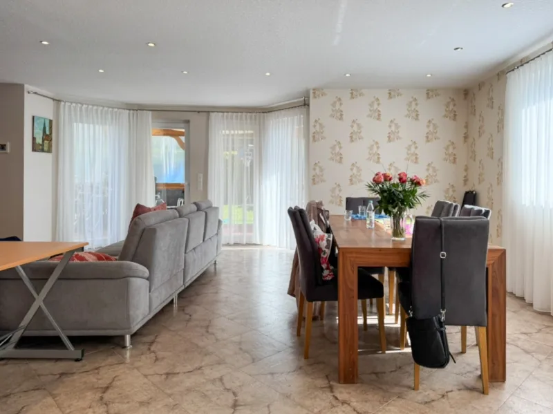 Im Erdgeschoss stehen Ihnen rund 124 m² Wohnfläche zur Verfügung. Herzstück ist der helle Wohn- und Essbereich mit offener Küche und direktem Zugang zur sonnigen Südterrasse. Zwei Schlafzimmer sowie ein großzügiges Bad mit Dusche und Badewanne bieten beste Voraussetzungen für komfortables Familienwohnen.