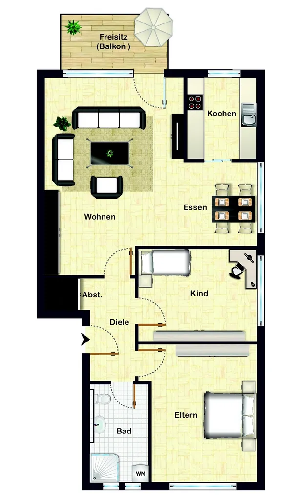 - Küche, Flur, Abstellraum und Bad sind gefliest. In allen Wohn- und Schlafräumen ist Massivparkett verlegt.