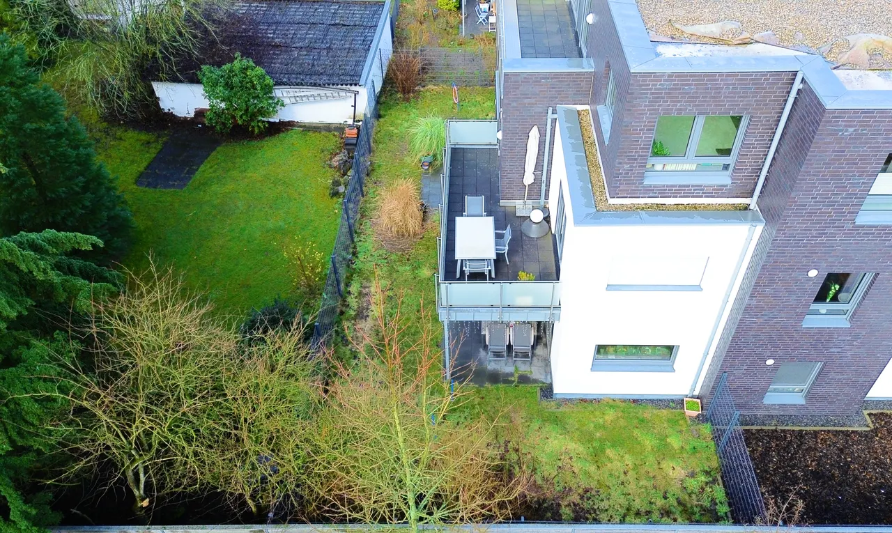Die knapp 30 m² große Terrasse bietet viel Platz für eine Lounge-Ecke und lädt zum Grillen oder Chillen ein. Somit wird der gesamte Außenbereich ein großzügiges "Outdoor-Wohnzimmer" und idealer Rückzugsort für Sie sein.