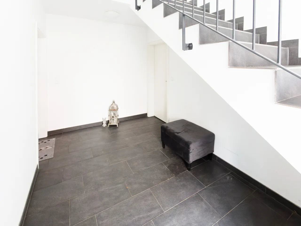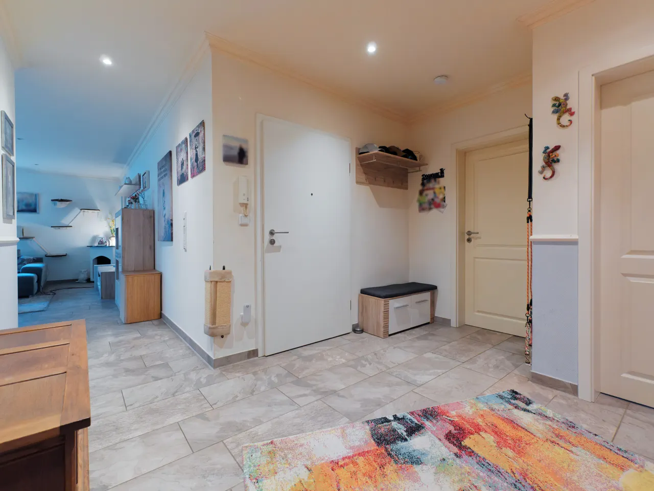 Als Grundbeleuchtung wurden in vielen Räumen Deckenspots eingebaut. Innerhalb der Wohnung sind die Böden mit stylischen Fliesen, teilweise in Holz-Optik ausgestattet. Das Treppenhaus ist mit Feinsteinzeug in der Farbe anthrazit ausgelegt.