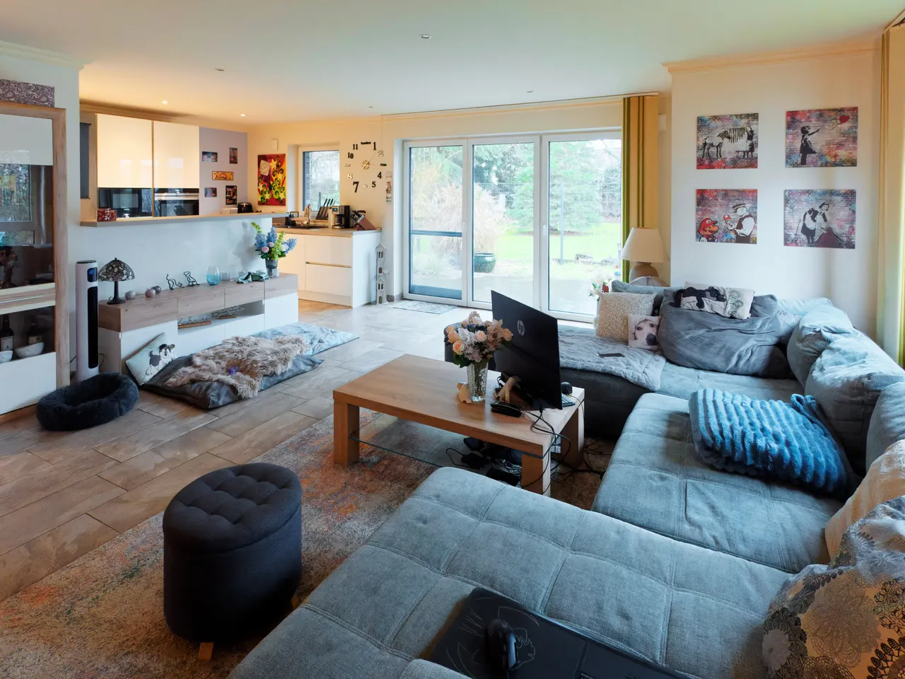 Beim Betreten der großen Diele fällt sofort der großzügige, lichtdurchflutete Wohn-/Kochbereich auf, der zusammen 42 m² Platz für gemütliche Abende und gemeinsames Kochen in der zeitgemäß offenen Küche bietet. Diese ist in Hochglanzoptik, verfügt über eine Frühstückstheke, E-Geräte von Siemens und viele Annehmlichkeiten, die Sie von einer modernen Küche erwarten. Sie ist im Verkaufspreis enthalten. Direkt daneben befindet sich der praktische Vorratsraum.