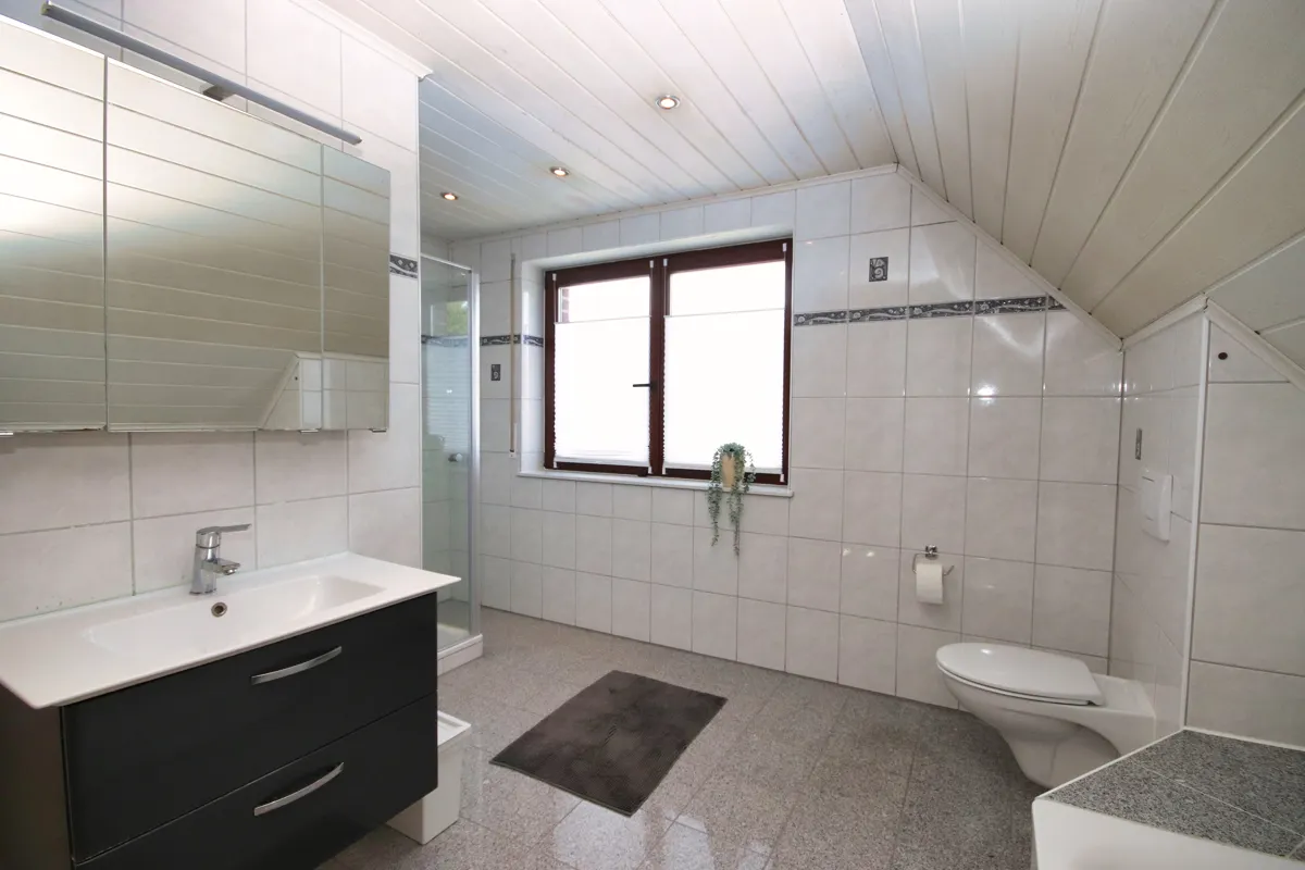 Das Obergeschoss punktet mit drei Schlaf-/Arbeitszimmern und einem Tageslicht-Badezimmer, welches sowohl über eine Dusche als auch eine Badewanne verfügt. Der Spitzboden bietet zusätzlichen Platz, um verschiedenstes zu verstauen. Auch als Spielfläche für Kinder kann er genutzt werden.