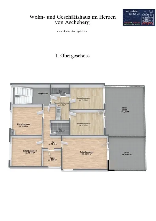 Praxis 1; ca. 98 m² Nutzfläche, langfristig vermietet, 3 Zi., große Küche, 2 Toiletten neu gefliest, Dachterrasse