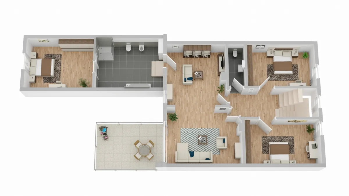 Das Wohnhaus bietet eine großzügige und vielseitige Aufteilung über drei Ebenen. Im Erdgeschoss befinden sich eine offene Küche mit Essbereich und Zugang zur Kiesgartenfläche, ein Badezimmer mit Wanne und Dusche, ein Schlaf- oder Gästezimmer sowie der Zugang sowohl zum Ladenlokal als auch zum Patio. Eine große Diele rundet diesen Bereich ab.