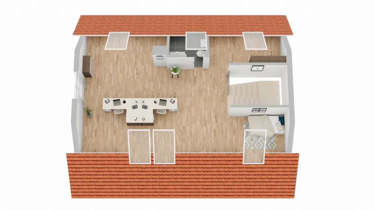 Das Obergeschoss überzeugt mit einem modernen Bad mit großer Dusche, einem zusätzlichen eleganten Wannenbad mit WC und Bidet, zwei Schlafräumen sowie einem großzügigen Wohnzimmer, das aus zwei ehemals separaten Zimmern besteht und Zugang zur Dachterrasse bietet. Das Dachgeschoss ist als helles Studio mit offener Balkenlage ausgebaut; Anschlüsse für ein weiteres Badezimmer sind vorhanden.