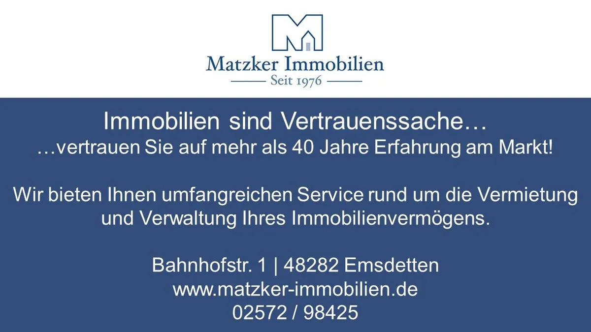Stadtnahe Wohnlage in Emsdetten. Zum Stadtzentrum mit Einzelhandelsgeschäften, Ärzten und Apotheken und dem Bahnhof sind es nur ca. 1,3 km. Einkaufsmöglichkeiten für den täglichen Bedarf, befinden sich fast um die Ecke. Emsdetten mit ca. 36.500 Einwohnern, im Herzen des Kreises Steinfurt gelegen, erfreut sich immer größerer Beliebtheit. Der Stadtkern bietet mit seinen attraktiven Einkaufsmöglichkeiten und den zwei Markttagen ein reizvolles Flair. Neben einem Kino verfügt die Stadt auch über eine belebte Gastronomie. Die EMS-HALLE, eine der größten Veranstaltungshallen der Region ist regelmäßig Bühne für Top-Veranstaltungen aus Musik, Theater, Sport und Comedy. Genießen Sie per Rad, Pferd, oder zu Fuß die unberührte Natur im Emsdettener Venn. Die Ems mit den Emsauen ist eine gute Basis für eine Kanutour. Außerdem zeichnet sich Emsdetten durch eine hervorragende Verkehrsanbindung aus. Die Universitätsstadt Münster und die Stadt Rheine liegen in unmittelbarer Nähe, mit der Deutschen Bahn sind Sie schnell am Ziel. Auch die Städte Osnabrück und Enschede sind durch die verkehrsgünstige Lage schnell erreicht. Zum internationalen Flughafen Münster/Osnabrück brauchen Sie nur ca. 15 Autominuten.