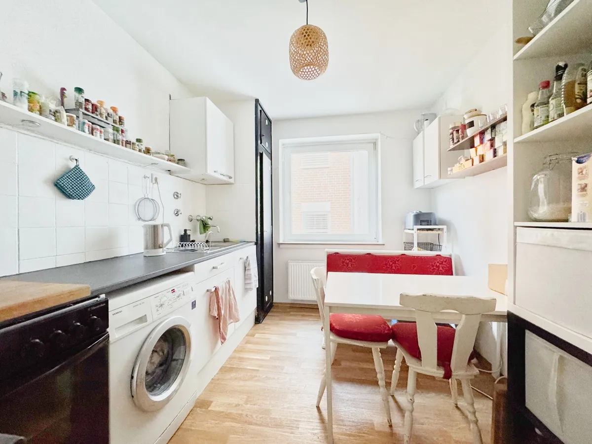 Die großzügige Küche bietet Platz auch für einen Esstisch und verfügt zudem über einen Waschmaschinenanschluss.
