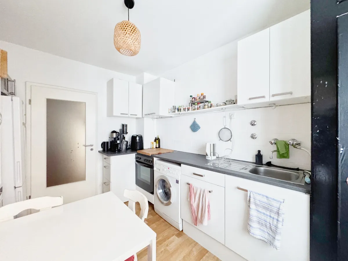 Die großzügige Küche bietet Platz auch für einen Esstisch und verfügt zudem über einen Waschmaschinenanschluss.