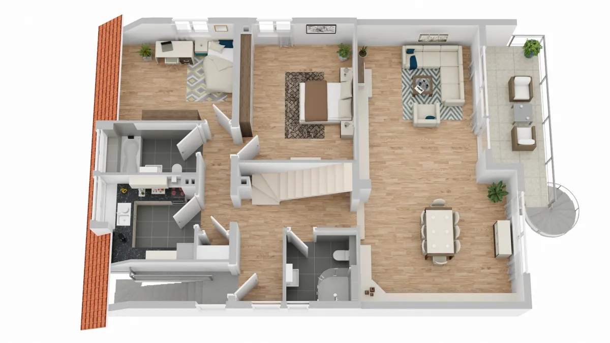 Die Maisonette-Wohnung im Obergeschoss erstreckt sich über 130 m² und verfügt zusätzlich über ein großzügiges Dachstudio sowie einen geräumigen Balkon, der ebenfalls zum Verweilen im Freien einlädt. Ein direkter Treppenabgang vom Balkon ermöglicht auch den Zugang zum Garten.