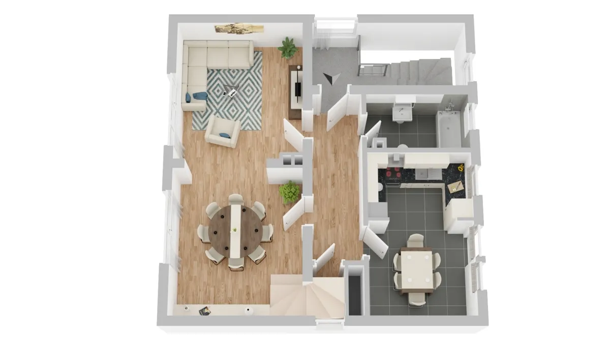 - Erdgeschoss: ca. 67 m², drei Zimmer, Küche, Bad, Gäste-WC