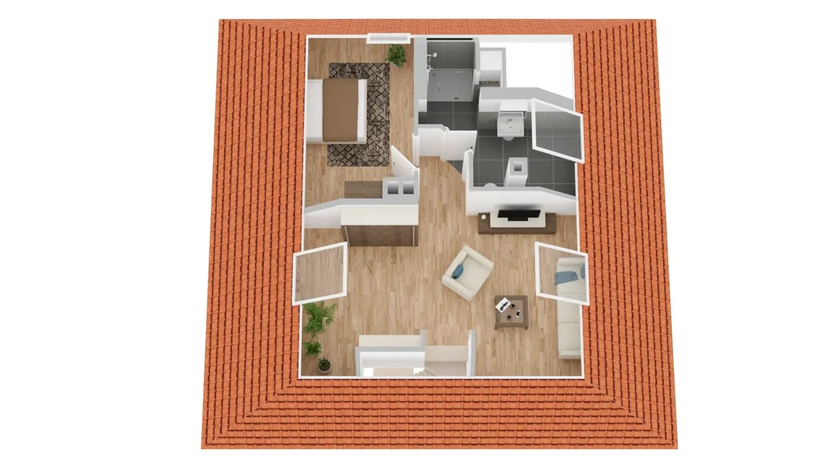 - Dachgeschoss: ca. 45 m², drei Zimmer
